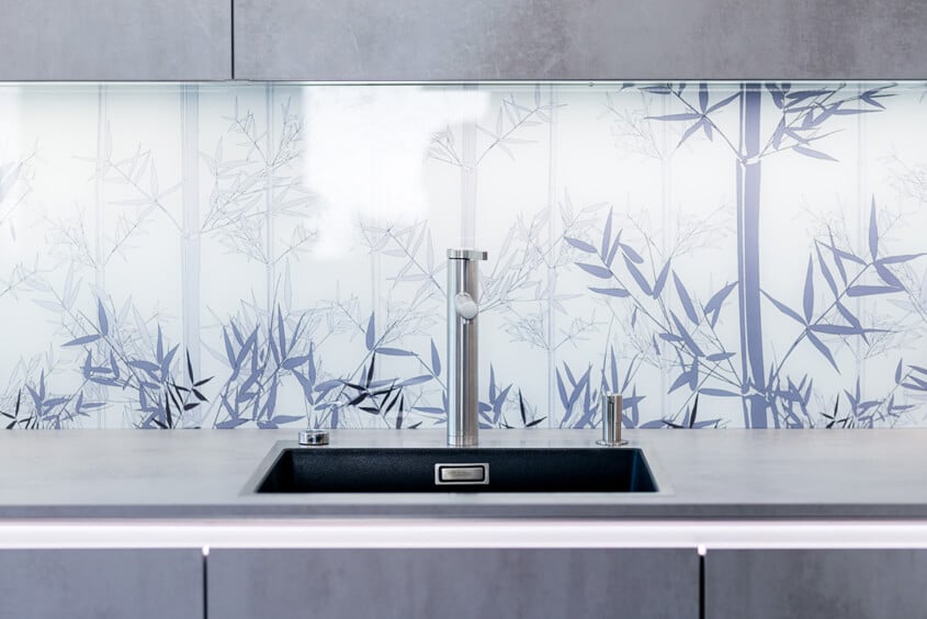Die Küche ist kombiniert mit einer Glasrückwand und einem Spiegelsockel.