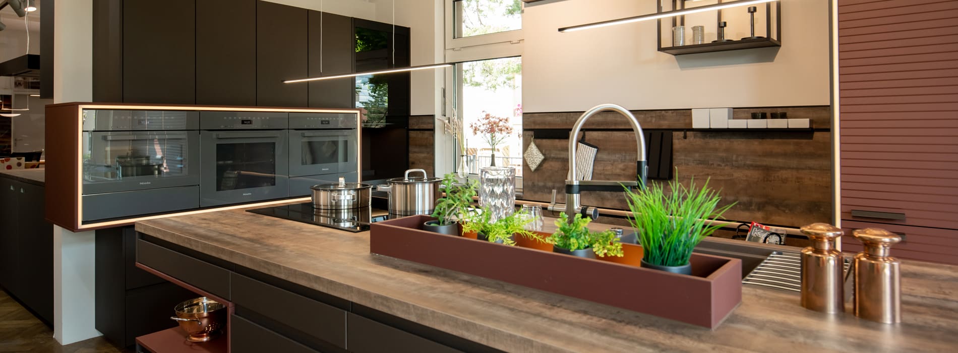 Die Front ALENA SATIN in der Farbe Mokkabraun Satin ist eine moderne geradlinige Front. Der Griff ist in die Front eingearbeitet und die Küche wirkt wie eine „grifflose“ Küche.